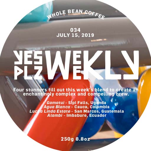 Four stunners fill out this week's blend to create a complex, compelling and sweet brew. Gamatui from Sipi Falls, Uganda. Agua Blanca from Cauca, Colombia. Lucita Linda Estate from San Marcos, Guatemala. Alambi from Imbabure, Ecuador.